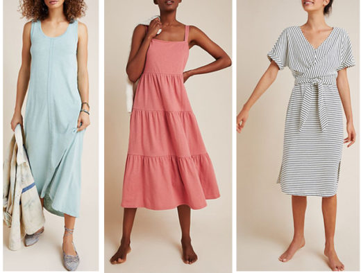 Left: Alma Midi Dress: Seamed detail. Scoop neck. Midi silhouette. Pullover styling. Machine washable cotton. Falls 47.25″ from shoulder. $98.00