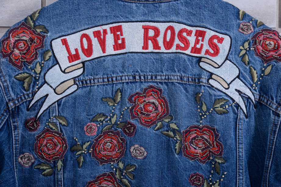 Left: The “Crane” Embroidered Denim Jacket: Grey stonewashed denim. Heavyweight embroidery Full button-front closure. Sale $89.99
