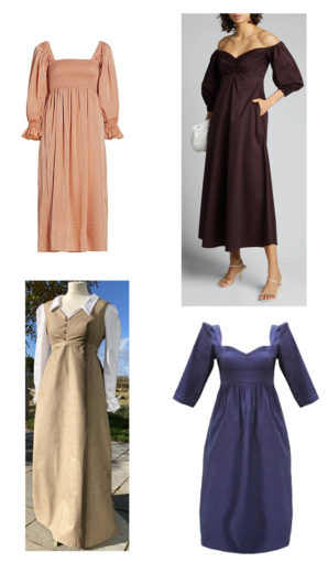 Dresses I Left to right Real Regency fashion most often fell in a column like the first dress. These necklines, empire waists, and often sleeves speak of the era.