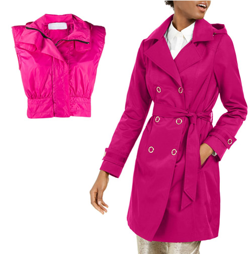 Right: Double-Breasted Hooded Water-Resistant Trench Coat by Anne Klein: Approx. 36″ long from center back to hem. Notched collar with removable hood; front double-breasted button closures. Self-tie belt. Two welt pockets at front. Water-resistant Machine washable, lined cotton/polyester. $160.00