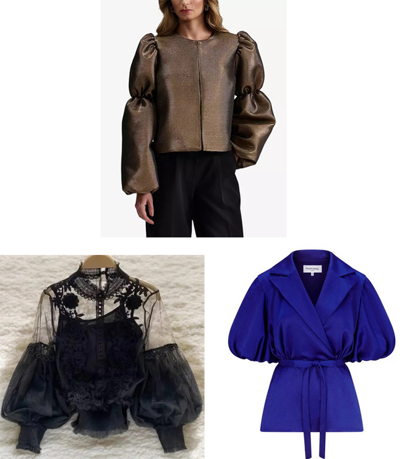 Right: Melanie Puff Sleeve Bodysuit by Fifth & Welshire: Stretch satin faux wrap front, over-sized organza puff sleeves, and shoulder pads for structure. Lined polyester with thong, nylon panty. Side Zipper. Snap Closure. Shoulder Pads. Sale $108