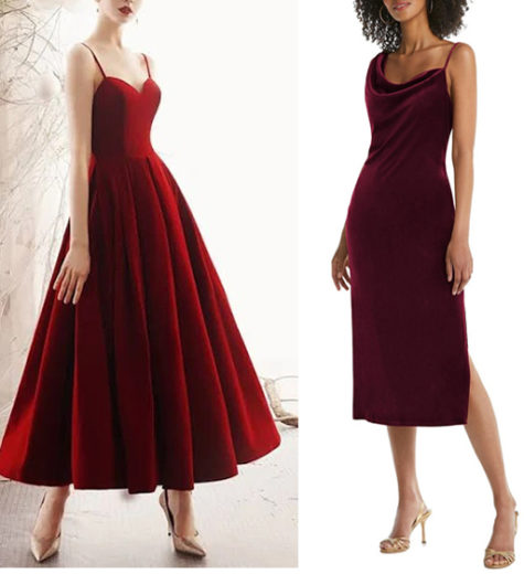 Right: Asymmetrical One-Shoulder Velvet Midi Slip Dress: Designed with a cowl back and side slit. Unlined-needs a slip. Polyester. Slips over the head. $194.00