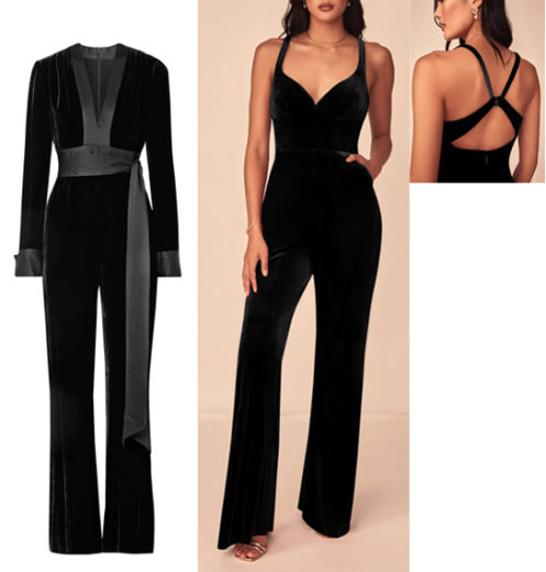 Left: Black Velvet Jumpsuit: Polyester Velvet and satin charmeuse trim Flare silhouette Hidden zip at back Tie at waist Plunging v neck. Sale $149.00