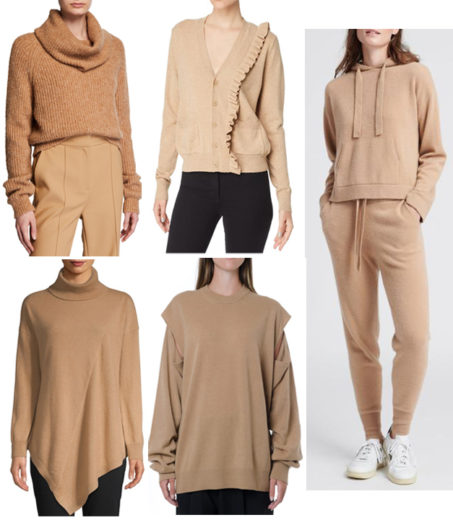 The first cool winds of autumn bring camel (color) back as surely leaves tumble down. (Summer khaki is not as yellow.) Whether you own/buy a classic coat, or camel as separates, the tone is de rigueur. Careful to check fabric content. Some of these are transition, others warmer.