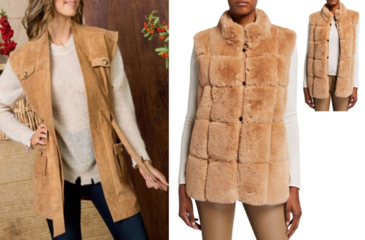 Right: Belle Fare Faux Fur Vest– Polyester fur, polyester lining. Stand up collar. Snap front. $270.00
