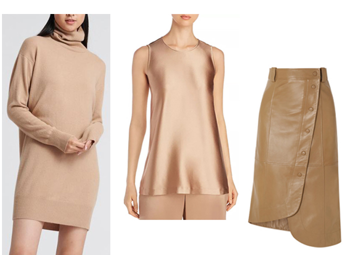 The first cool winds of autumn bring camel (color) back as surely leaves tumble down. (Summer khaki is not as yellow.) Whether you own/buy a classic coat, or camel as separates, the tone is de rigueur. Careful to check fabric content. Some of these are transition, others warmer.