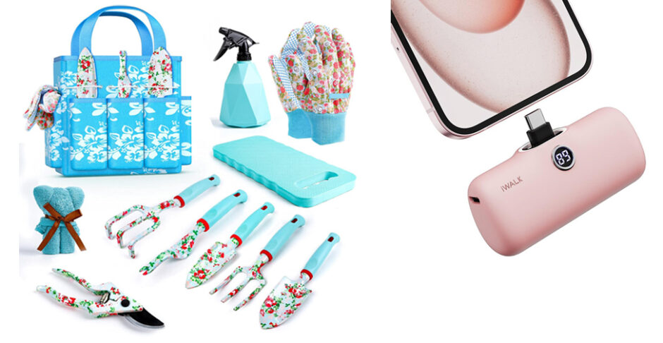 Left: JUMPHIGH Womens Gardening Gift Set: Aluminum -Trowel, transplanter, hand rake, cultivator, weeder, pruning shears, watering spray bottle, kneeling pad, cleaning cloth, garden gloves and tote organizer. Six metal hand tools are made of heavy duty cast aluminum alloy, high hardness, sturdy and durable. The carbon steel pruning shears are sharp and helps cut stems and shallow branches easily. Sale $28.99