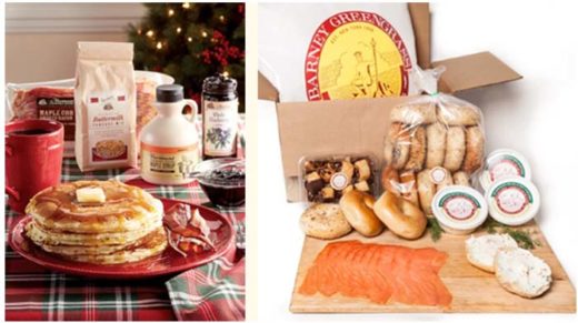 Left: The Vermont Country Store Vermont Sunday Breakfast Gift Box: “Everything needed for a Vermont Sunday morning, except the cows!” Buttermilk Vermont maple pancake mix (1 lb. bag) Vermont finest grade A maple syrup (1 pint) Whole blueberry preserves (10 oz. jar) Cob-smoked bacon cured with maple syrup (1 lb.) $49.95