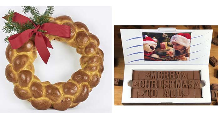 | Left: Eli Zabar Brioche Holiday Wreath: Edible 12” braided brioche wreath tied with a red bow and every bit as delicious as their famous rich buttery braided loaves. $45.00 |