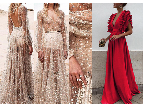 Right: Elaborate Sleeve Gown– Plunging neckline, on-trend sleeves. In grey, black, or red. On Sale $58.95