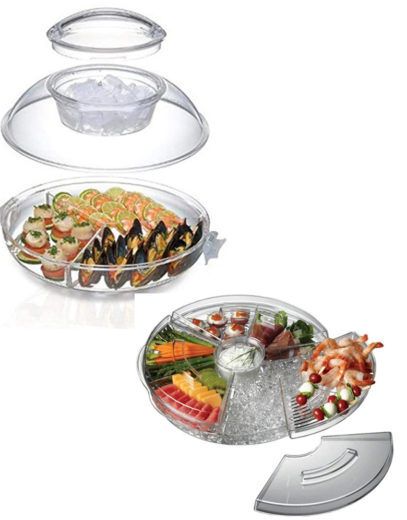 Top: Prodyne ICED Go Appetizer Tray: Large 3 compartment tray, a clip-on dome lid with built-in ice chamber and carry handle. 12.75 x 12.75 x 7.5 inches. Acrylic. $49.99