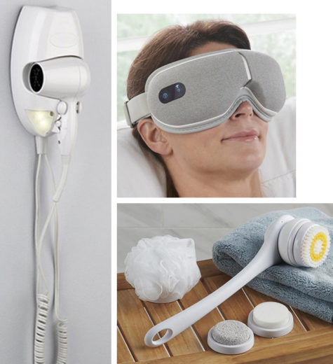 The Wall Mounted Fine Hair Dryer: Dries delicate hair softly without causing split ends. Its 1,600-watt electric motor produces two speed settings and two heat settings. With a removable filter, built-in LED nightlight, and auto shut off. Mounts to a wall with included hardware. AC plug with 72″ cord. Sale $19.95