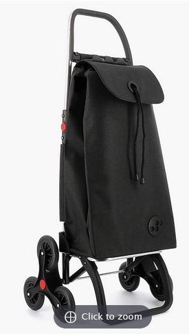 Top: The Stair Climbing Carryall: effortlessly transports a load up to 88 lbs. as it “climbs” stairs and curbs. Its unique six-wheel design maintains contact with both the horizontal tread and the vertical riser on each step, preventing strain and the jostling of cart contents. Lightweight aluminum frame, silent wheels, and a folding handle. Its wheels also detach and the unit folds down for compact storage in a closet or car trunk. Black Tweed. Open 423/4″ L x 15″ W x 19″ D, folded 26 1/2″ L x 11 1/4″ W x 19″ D. $149.95