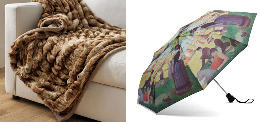 Left: Faux Fur Ruched Throw: 50”x 60” Cozy throw is created with silky fibers and ruched for a cascading ripple effect. Longer, ultra-plush pile and substantial weight set it apart. Velvet binding. 12 colors Sale $125
