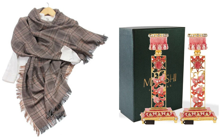 Left: Plaid Wool Scarf: Fluttery Fringe Grid plaid design edged with fluttery fringe Material: 96% wool Approximate size: 33.5 x 79 inches $64.15