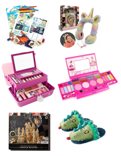 Musical Unicorn Headphones: – Ages 5+ Cozy over-ear headphones feature a shimmering design and built-in horn on top of the headband.9.25″ x 3.2″ x 11.5″ Built-in 5-ft. audio cable with a 3.5mm audio jack that’s compatible with most audio sources. Ear cups are padded and plush for comfortable wear. If your smart device doesn’t have an audio port, you may need an adapter. $29.99