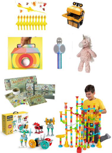 DIY Money Bank Robot Toy: Build-it-yourself automated bank snatches up coins and teaches children how to save. Requires one AAA battery (not included). Ages 8+. Made of yellow and black plastic. Box: 5.5h x 4.5w x 2″d. $18.00