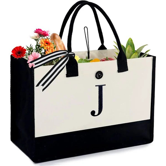 BeeGreen Canvas Tote Bag with Embroidered Monogram: 17″ wide + 12.5″ tall + 6.7″ bottom gusset with a 24″ reinforced canvas handle. $16.99