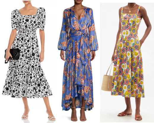Left: Hydrangea-Print Calf-Length Cady Dress by Dolce & Gabbana: Sweetheart neckline 3/4 sleeves Stretch silk crepe de chine lining Rear zipper and hook-and-eye fastening $2845.00