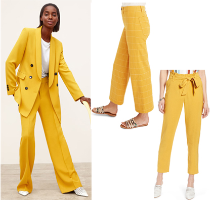 Zara Yellow Statement Suit– Cool. High-waisted pants with front pockets back false welt pockets. Flared legs. Front zip, button and metal hook closure. Polyester/viscose/elastane. $69.90