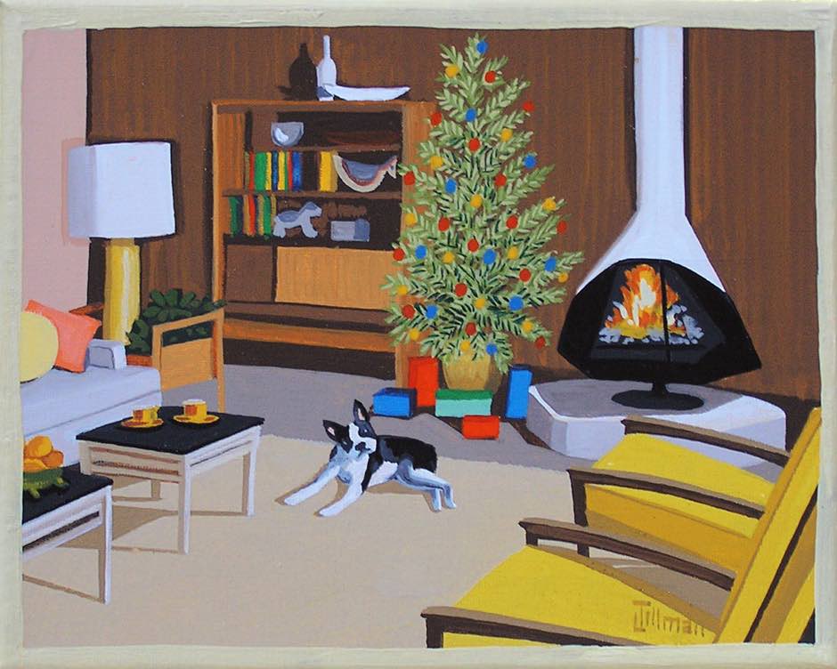 A dog owner herself, Linda manages to include man’s (and woman’s) best friend in most of her paintings. The breeds range from shepherds to Boston terriers and everything in between. Indoor scenes, with a TV set tuned to a favorite 50s show like The Twilight Zone, may find a cat or two curled up on a rug. Several of her paintings reflect the holiday season, with the addition of a wreath or Christmas tree.