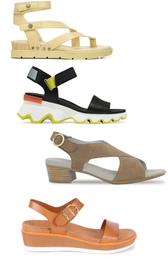 Kinetic Leather Wedge Sport Sandals by Sorel: 3 colorways. Comfort-focused footbed and a scalloped rubber sole Leather upper Open toe Ankle strap with grip-tape closure Leather lining Padded insole Wedge heel, 2.25″ Platform height, 1″ $130.00
