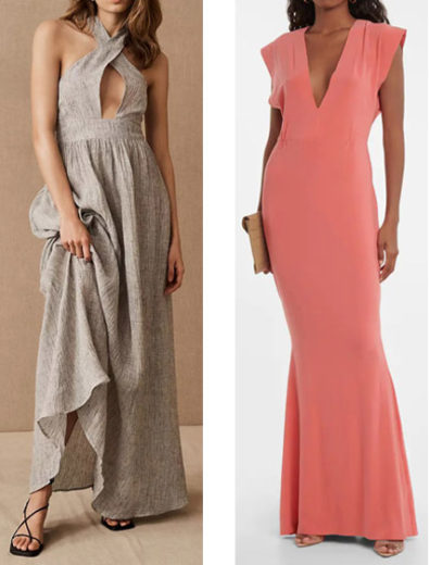 Right: V-neck Maxi Gown by Norma Kamali: Body slimming jersey with a plunging neckline. 95% polyester, 5% elastane. Seamed waist. Sale $154.00