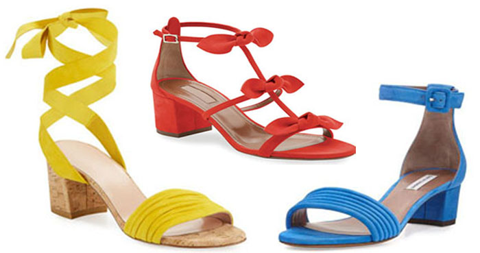 Left: Stuart Weitzman Swiftycork Suede Ankle-Wrap Sandal– Walkin’ on sunshine. 2.5″ covered block heel. Ruched strap bands open toe. Self-tie ankle-wrap strap. Padded footbed. Leather outsole. $398.00