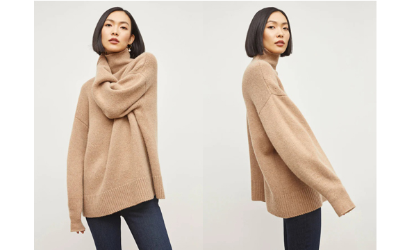 The Lee Sweater by MM LaFleur – Extra plush cashmere. Drop shoulder, rounded sleeve, and tunic length. Note the gradient stitch at the cuff which creates a slim fit through the wrist and adds dimension to the sleeve. Three colors. $525.00.