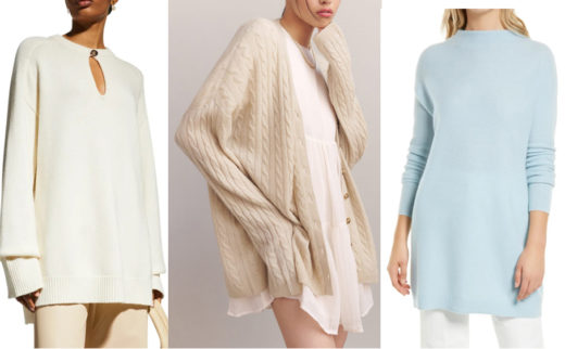 Oversized Cutout Sweater by Loulou Studio – Ribbed trim along the neckline, cuffs, and hem. Approx. 27″ length from shoulders to hem. Crew neckline, button front, raglan seams. Wool/cashmere. $475.00.