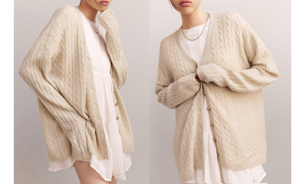Left: 90s Oversize Cardigan by ReDone: V-neck Ribbed cuffs and hem 60% recycled wool, 20% recycled polyamide, 20% lyocell Pockets $495.00