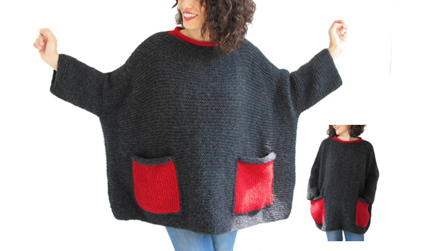 Opening: Oversized Hand knit Wool Sweater: knitted with high quality, thin and anti allergic wool & angora blended yarn. It has 2 pockets. Color can be changed to order. Sale $100.00 Grey with yellow pockets.