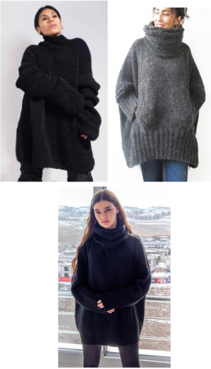 Long, wide, drop shoulder- sometimes a combination. Wool, alpaca, mohair. Bundle up. Wear an underlayer too.