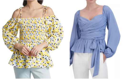 Left: Valerie Peplum Blouse by Tanya Taylor: Smocked cotton with a watercolor print and peplum hem. Straight neck Tie-shoulders Long sleeves Pullover style Sale $97.99