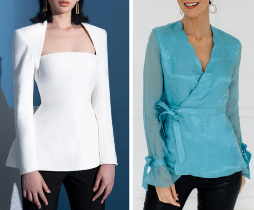 Right: The Lisa by T001: Also pink. Sheer organza sleeves, peplum. Rap with tie Bowed cuffs. Scalloped V $175.00