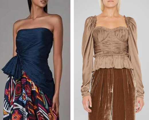 Peplum: a short flared, gathered, or pleated strip of fabric attached at the waist of a woman’s jacket, dress, or blouse to create a hanging frill or flounce.