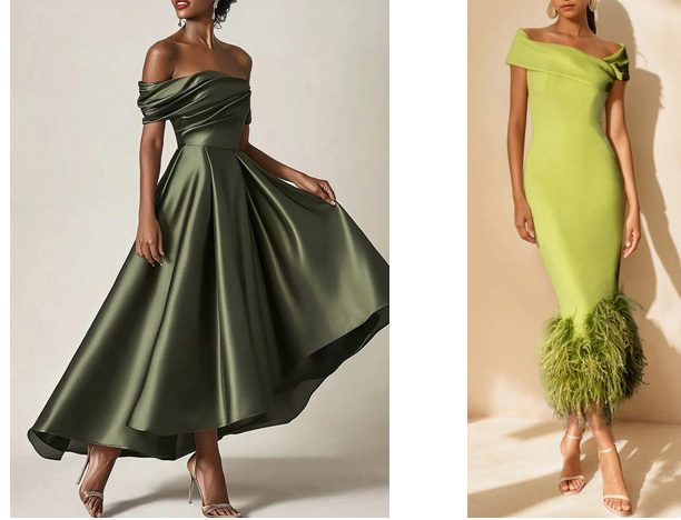 Right: Feather Hem Sheath: Off the shoulder. Back zipper closure. Polyester with sheen. Dozens of colors. $199.99