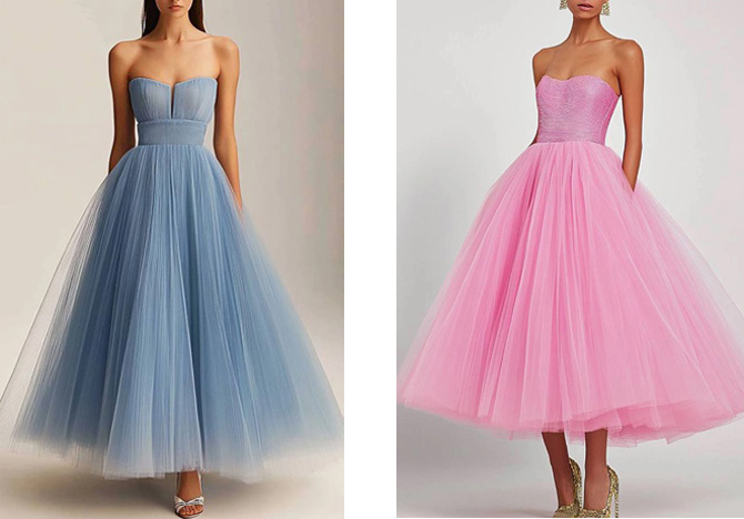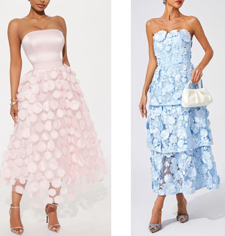 Left: Tina Tulle Midi Dress: Strapless 3D Flower Skirt. Elastic waistband. Back zipper closure. Lined. Stretch polyester. Fitted waist. $49.99