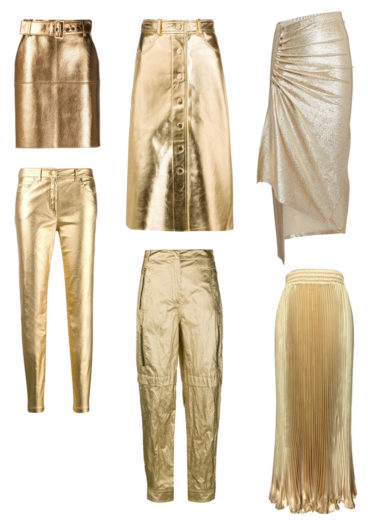 Asymmetric Ruched Metallic Midi Skirt by Paco Rabanne: Gold lamé midi strategically ruched for a wrap silhouette. Viscose/polyester/elastane. 27″ from waist to hem. $470.00