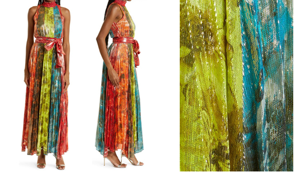Opening: Mertie Metallic Stripe Floral Maxi Dress by Alice & Olivia: Shimmer stripes. High neck Sleeveless Lined 95% wool, 3% cotton, 2% elastane Sale $646.75