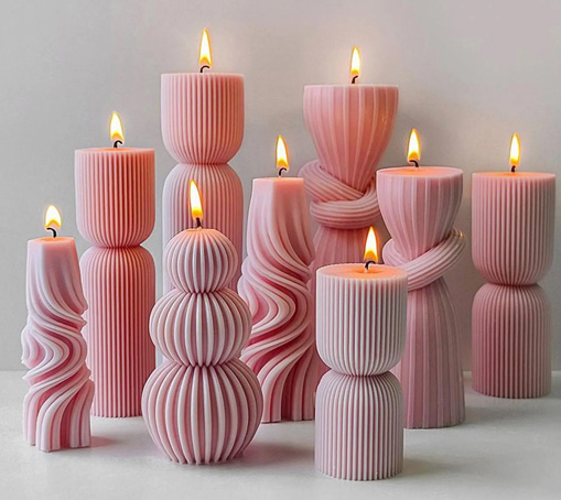 Left: Tall Soy Wax Candle Sets of 2 14 colors; Soft Twist- $18.26, Medium Twist – $18.26, Deep Twist – $18.26, Bubbles $20.25 11.8” h