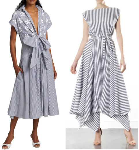 Left: Manny Striped Cotton-Blend Shirtdress by Silvia Tcherassi: Point collar Plunging V-neck Short sleeves Pull-over style Self-tie bow at front Side seam pockets 98% cotton/2% polyester $895.00