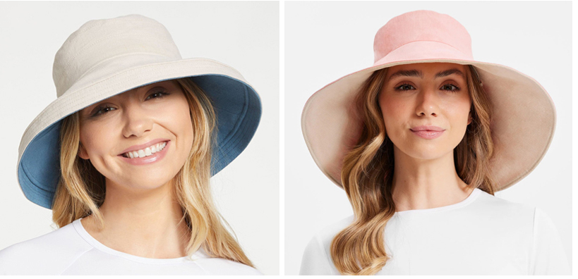 Left: Holiday Sun Hat UPF50+: Two tone Flexible brim length of 4″ that benefits from an internal wire, giving it a fully customizable shape. Features a reversible double layer of luxurious cotton-linen blend fabric with a drawcord to keep it secure. 6 reversible colors $59.00