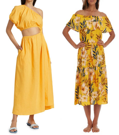 Left: Restful Off-the-Shoulder Linen Dress by Trina Turk: Off-the-shoulder neckline. Short sleeves. Flounce popover bodice. Belt ties at waist. Shift silhouette. Hem hits about at the knee. Pullover styling.$258.00