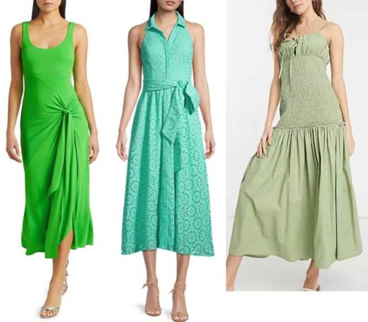Center: Green Salma Dress by Pomander Place: Cotton. V- neckline, tiered. Slip-over style. $128.00