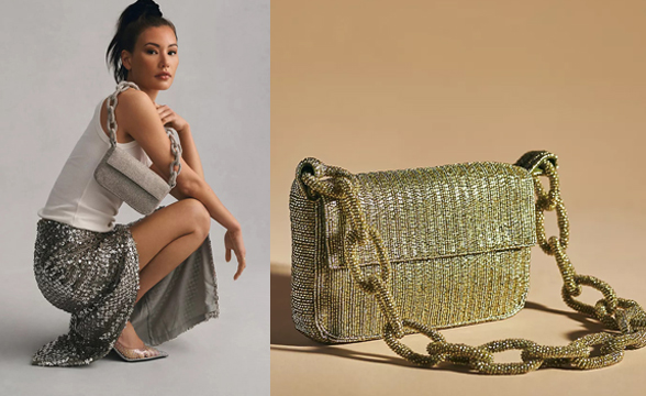 The Fiona Beaded Bag: Chain Edition: Polyester, glass bead embellishments; cotton lining One inner slip pocket Magnetic closure 4.25″L, 8″W, 1.5″D 10.5″ strap drop 6 colors $110.00