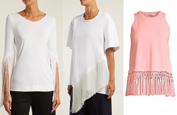 Left: Galvan Vesper Fringed Top – Basic viscose tee with on-trend fringe. Round neck, slim fit, short sleeves with tassel trim. Also in black. Sale $272.00