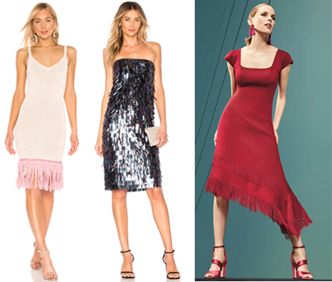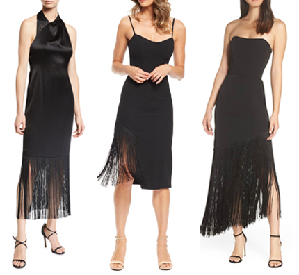 Center: Rory Midi Dress by Dress the Population– Unfussy, with kicky fringe panels. Hidden back zipper. Scooped neck. Adjustable straps. Lined polyester/nylon. Machine washable. $216.00