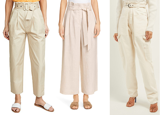 Center: TOPSHOP Rory Paperbag Waist Utility Trousers – Cool and stylish stretch khakis with zipper fly and button closure; tie waist. Machine washable lyocell/cotton/elastane. $79.00