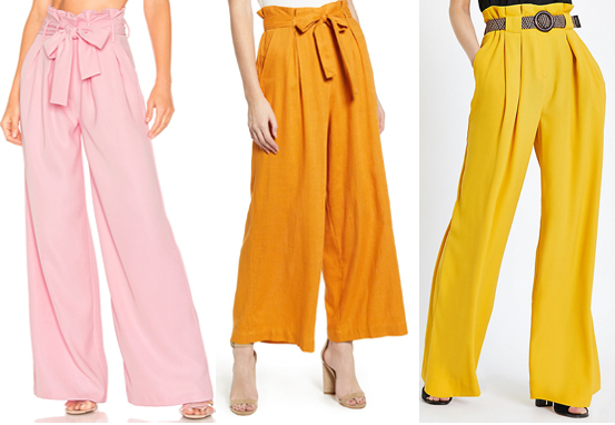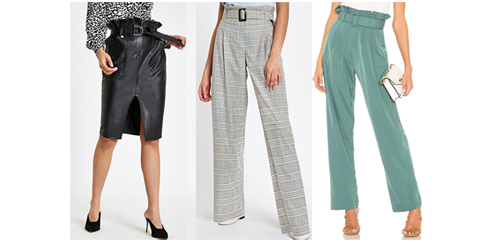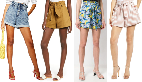Gathered at the waist and extending above, paperbag waists can be found on shorts, pants, and skirts this season. Make sure these are big enough not to clutch hips. Crop top or tuck-in.